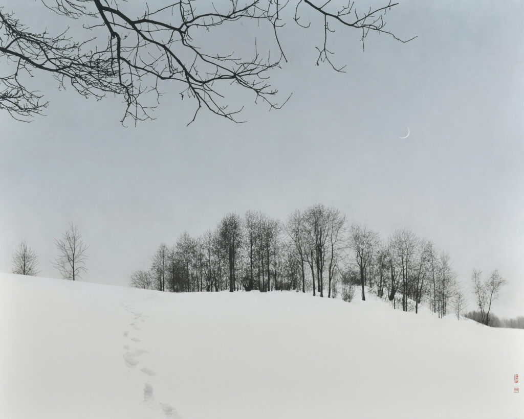 画面に広がるのは自然の風景でありながら、観る者の感情や記憶を静かに呼び覚ます世界。精緻な枝ぶりや霧の濃淡の描写には、作家の鋭い観察眼が宿る。神々しさを帯びた風景は、まるでその場に身を置くような没入感をもたらす。